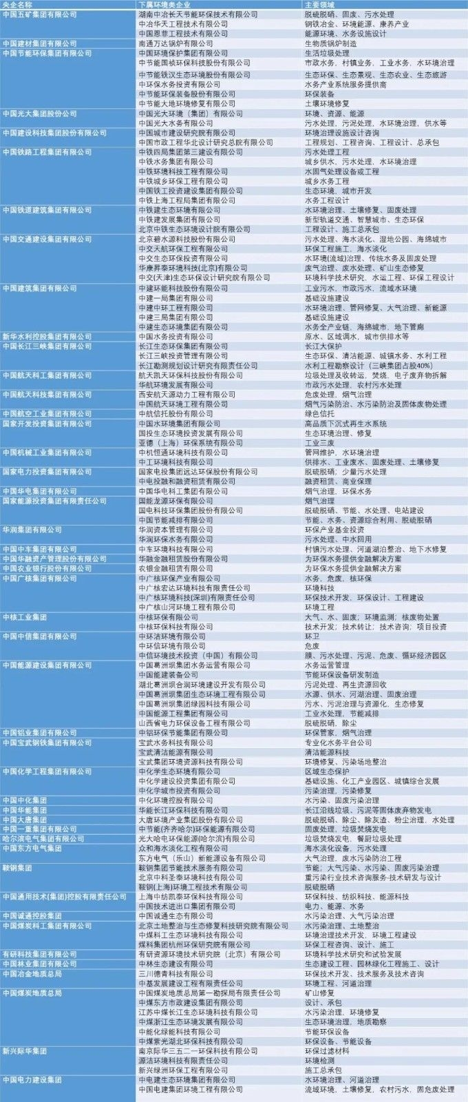 央企及其下屬環(huán)境類企業(yè)統(tǒng)計表
