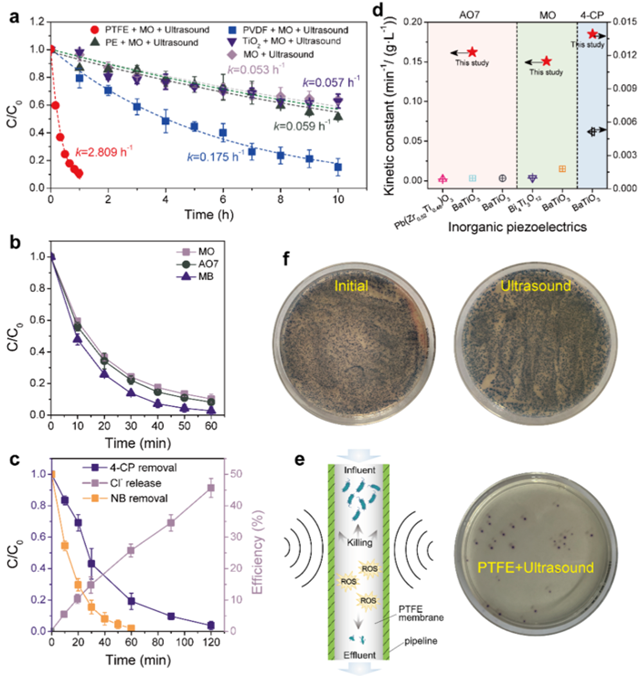 PTFE壓電催化產(chǎn)生ROS的潛在應(yīng)用:ROS在環(huán)境、化學(xué)以及生物醫(yī)藥領(lǐng)域具有廣泛應(yīng)用。例如,PTFE在超聲作用下能分解甲基橙、酸性橙7、亞甲基藍(lán)、四氯酚以及硝基苯等多種污染物。與傳統(tǒng)有機(jī)和無機(jī)壓電材料對比發(fā)現(xiàn),PTFE分解甲基橙的準(zhǔn)一級速率常數(shù)是經(jīng)典的有機(jī)壓電材料PVDF的16倍以上,也遠(yuǎn)高于目前文獻(xiàn)報道的無機(jī)壓電材料Pb(Zr0.52Ti0.48)O3,Bi4Ti3O12和BaTiO3。同時實驗結(jié)果表明,超聲輻射10 min,PTFE膜能顯著抑制細(xì)菌的生長,抑制率可達(dá)99.7%。以上結(jié)果表明,超聲活化的PTFE展現(xiàn)出了優(yōu)異的壓電催化性能,在環(huán)境污染治理中具有廣闊的應(yīng)用前景。