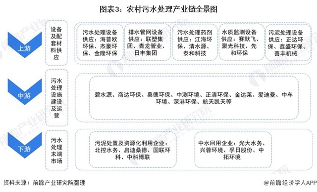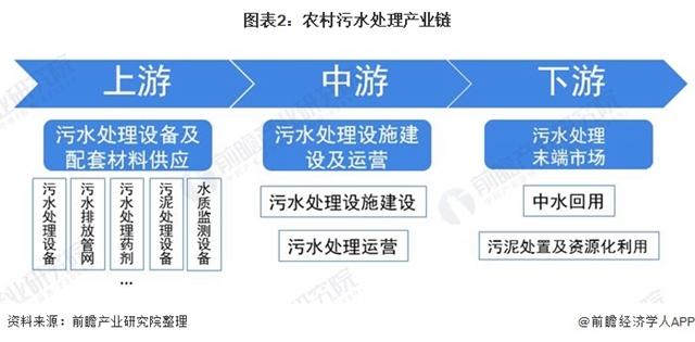 農(nóng)村污水處理行業(yè)上游供應(yīng)商一般為污水處理設(shè)備及配套材料供應(yīng);中游主要是農(nóng)村污水處理設(shè)施建設(shè),以及農(nóng)村污水處理設(shè)施建設(shè)后的運營、管理、監(jiān)督、維護以及其他管理性質(zhì)工作,如污水處理設(shè)施的服務(wù)外包,多種形式的委托經(jīng)營等;下游為污水處理末端市場,如中水回用、污泥處置及資源化利用等。