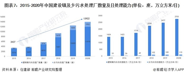 在國家政策的大力支持下,我國農(nóng)村污水廠數(shù)量飛速增長,污水處理能力穩(wěn)步提升,建設(shè)鎮(zhèn)及鄉(xiāng)污水處理廠數(shù)量由2015年的3437座增長至2019年的12480座,增速高達三倍左右。2020年,我國農(nóng)村污水處理工程持續(xù)推進,前瞻初步估計,截止2020年底,我國建設(shè)鎮(zhèn)及鄉(xiāng)污水處理廠數(shù)量分別達到了11970座和1952座;我國建設(shè)鎮(zhèn)及鄉(xiāng)污水日處理能力分別達到了2753萬立方米/日和115萬立方米/日。
