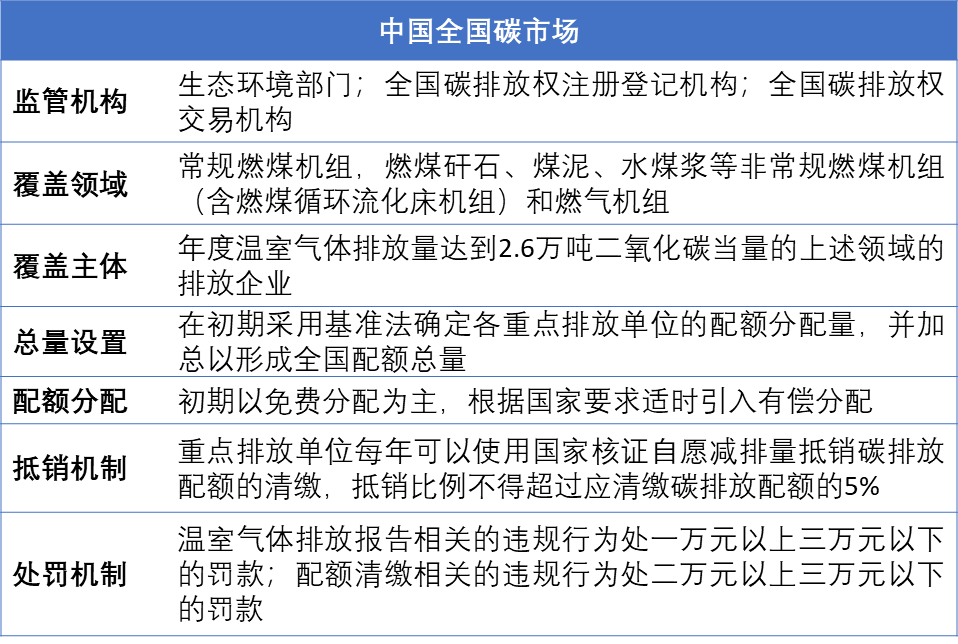 目前,中國的全國碳市場已經(jīng)進(jìn)入交易前的最后準(zhǔn)備階段。參考生態(tài)環(huán)境部發(fā)布的《2019-2020年全國碳排放權(quán)交易配額總量設(shè)定與分配實施方案(發(fā)電行業(yè))》、《碳排放權(quán)交易管理辦法(試行)》以及《碳排放權(quán)交易管理暫行條例(草案修改稿)》等文件,即將啟動的全國碳市場將以生態(tài)環(huán)境部門為主要監(jiān)管機(jī)構(gòu)、覆蓋范圍為化石能源發(fā)電及發(fā)熱行業(yè)的二氧化碳排放,在初期通過基準(zhǔn)法確定各重點(diǎn)排放單位的配額分配量,并加總以形成全國配額總量。此外,初期的配額分配將以免費(fèi)分配為主,同時允許以國家核證自愿減排量抵銷碳排放配額,抵消比例不得超過應(yīng)清繳碳排放配額的5%。相關(guān)的機(jī)制設(shè)計見下表:
