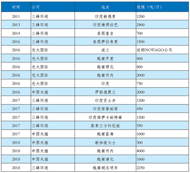 在固廢領(lǐng)域,具備自主設(shè)備制造能力的三峰環(huán)境、光大國(guó)際、中國(guó)天楹等企業(yè)也已經(jīng)成功邁出國(guó)際化的堅(jiān)實(shí)一步。以三峰環(huán)境為例,2013年投資并運(yùn)營(yíng)多座生活垃圾填埋場(chǎng)、危險(xiǎn)廢物處理廠、垃圾資源化回收利用廠以及生活垃圾發(fā)電廠。同年,隆企集團(tuán)贏得印度首批垃圾發(fā)電項(xiàng)目,確定與三峰環(huán)境合作,并采用三峰環(huán)境提供的設(shè)備和技術(shù)方案。目前三峰環(huán)境的技術(shù)設(shè)備已應(yīng)用到美國(guó)、印度、埃塞俄比亞、泰國(guó)、斯里蘭卡、越南、巴西等七個(gè)國(guó)家的垃圾焚燒發(fā)電項(xiàng)目。