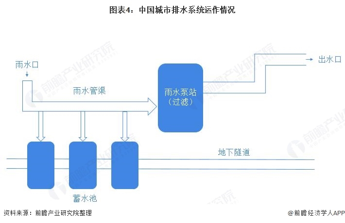 城市內(nèi)澇治理與完善城市排水系統(tǒng)密不可分。從城市排水系統(tǒng)運(yùn)作情況來看,首先,雨水會(huì)順著雨水口進(jìn)入雨水管渠,接著在雨水泵站過濾后,通過出水口流向湖泊或直接用于綠化澆灌等。如果遇到特大暴雨,管道也無法承載時(shí),雨水會(huì)進(jìn)一步分流至管道下方的隧道中,在降雨結(jié)束后送往污水處理廠進(jìn)行再次利用或排出到湖泊河流和人工水體中。