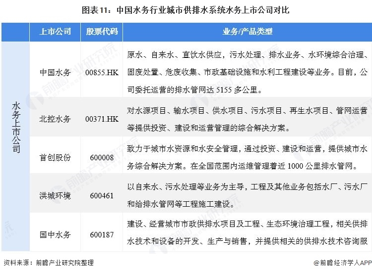水務(wù)行業(yè)主要上市公司:目前水務(wù)行業(yè)的上市公司主要有中國水務(wù)(00855.HK)、北控水務(wù)(00371.HK)、首創(chuàng)股份(600008)、洪城環(huán)境(600461)等。