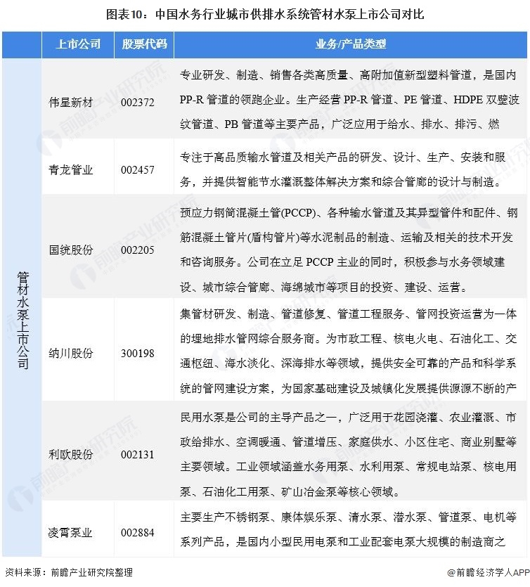 目前我國供排水管材水泵上市企業(yè)主要有偉星新材、青龍管業(yè)等管材上市公司;國統(tǒng)股份、納川股份等集管材和供排水建設(shè)的上市公司;利歐股份、凌霄泵業(yè)等水泵上市公司。其中,偉星新材是國內(nèi)PP-R管道的重點(diǎn)企業(yè)之一;利歐股份是中國在大分微型小型水泵制造商和出口商,先后為國內(nèi)五大發(fā)電公司、武漢鋼鐵、中國水利電力、中國寰球、中國石化、中國石油、南水北調(diào)工程淮河治理工程、引黃濟(jì)青工程、引灤入津工程、蘇丹尼羅河泵站、印度尼西亞南望熱電廠等服務(wù)。