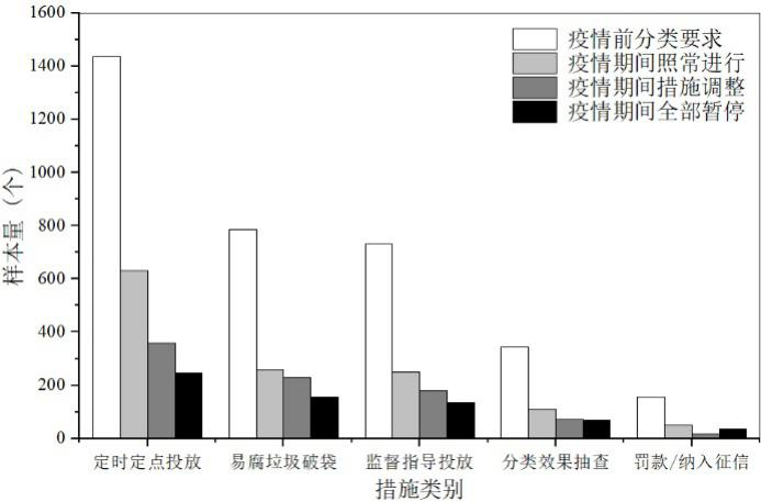 社區(qū)垃圾分類的推進對于疫情防控措施落實有明顯助益,作用機制可能是從社區(qū)工作組織和居民行為意識兩方面進行提升(圖1)。分類越好的社區(qū)所采取的防疫及防疫分類措施越完善、居民防疫意識越強。針對垃圾分類與疫情防控工作間雙向促進特點,在社區(qū)工作推進過程中,應從兩項工作中互相汲取經(jīng)驗,凝練共性特征強化社區(qū)治理能力,提升居民素質。利用同步推進中的正協(xié)同效應,在組織部署工作時應統(tǒng)籌兼顧,抓住“疫后窗口期”,順應愛國衛(wèi)生運動大勢,在鞏固防疫成效基礎上大力推進社區(qū)垃圾分類工作。疫情期間生活垃圾分類體系的響應主要表現(xiàn)在調停分類措施與新增防疫措施兩方面。55.3%已開展分類社區(qū)做出分類調停改變,其中16.6%暫停了全部垃圾分類工作,措施調整則以暫停易腐垃圾破袋(59.8%)、撤除督導人員(56%)等人工依賴性高措施為主。85.5%社區(qū)新增防疫相關分類措施,新增措施以增設口罩專用收集桶(54.0%)、收集箱集中定點消殺(34.2%)為主,社區(qū)調整與新增措施比例及程度隨疫情風險增高而加大。疫情驗證了定時定點模式推廣可行性,凸顯智能化分類模式在無人監(jiān)管、無接觸條件下維持分類監(jiān)管力度、保障分類質量的巨大優(yōu)勢,應進一步挖掘智能化分類模式應用潛能。
