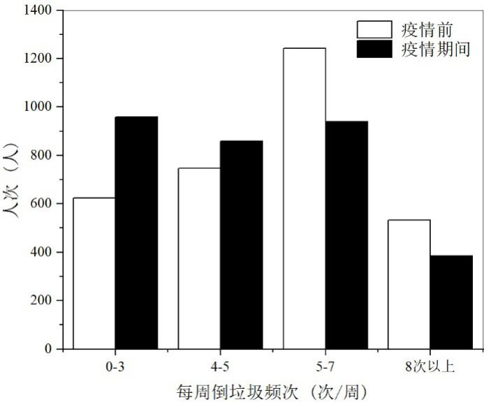 疫情導致社區(qū)垃圾分類基礎成分產(chǎn)生明顯變化,廢棄口罩大量增加,居民投放垃圾頻次顯著降低。疫情期間,人均廢棄口罩產(chǎn)生頻次約為3.7個/周,將近一半(48.2%)被調查者平均每周產(chǎn)生廢棄口罩數(shù)量在0~3個范圍;30.6%居民投放垃圾頻率降低,由疫情前5~7次向疫情期間低頻段轉變趨勢明顯,疫情越嚴重地區(qū)口罩產(chǎn)頻更高、投放垃圾頻率降低更多。針對垃圾組分變化,社區(qū)應貫徹落實垃圾分類,對涉疫垃圾分類分流收集處置,并靈活調整疫情期間垃圾清運計劃,總結居民行為規(guī)律,適時調減清運頻次降低成本。