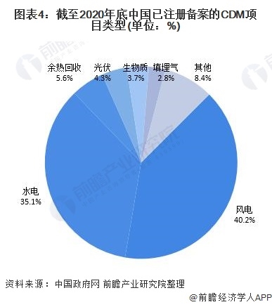 從項目類型來看,截至2020年底,我國已注冊備案的CDM項目主要集中于風(fēng)能、水力等領(lǐng)域,兩者項目達(dá)2834個,占比達(dá)78.7%。