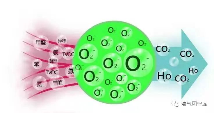 負(fù)離子與氣體分子(原子)發(fā)生非彈性碰撞,發(fā)生激發(fā)、離解、電離等一系列反應(yīng),使氣體處于活化狀態(tài)而產(chǎn)生的活性自由基以活化污染物分子,分子發(fā)生斷裂而被分解,最終可將惡臭氣體轉(zhuǎn)化為 CO2,H2O 等空氣中常態(tài)分子。