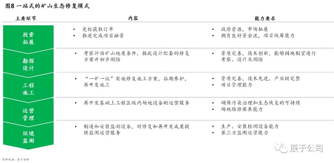 參考國際成熟經(jīng)驗,我們認(rèn)為未來EPC仍然是主流模式。不過隨著推進大礦山生態(tài)修復(fù)勢在必行,預(yù)計PPP項目數(shù)量將有所增加,尤其是遼寧、河南、山東、內(nèi)蒙古等礦山生態(tài)修復(fù)走在前列的省份值得關(guān)注。當(dāng)然,這對入局企業(yè)也提出了更高要求,他們不僅要有較強的政府資源和市場拓展能力,還要關(guān)注礦山生態(tài)修復(fù)多環(huán)節(jié)的打通,提升諸如生態(tài)環(huán)境考察評估、破壞診斷、方案設(shè)計、修復(fù)系統(tǒng)構(gòu)造、生態(tài)景觀建設(shè)、系統(tǒng)跟蹤與維護、環(huán)境監(jiān)測等各項能力,打造一站式整體修復(fù)模式(見圖7)。
