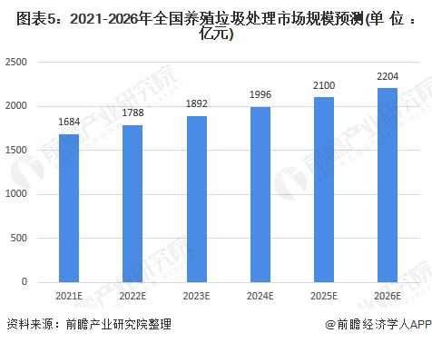 畜禽糞污資源化利用的步伐明顯加快,有力促進(jìn)了畜牧業(yè)生產(chǎn)與環(huán)境保護(hù)協(xié)調(diào)發(fā)展。前瞻初步預(yù)計(jì)到2026年,我國(guó)養(yǎng)殖垃圾處理市場(chǎng)規(guī)模將達(dá)到2200億元。