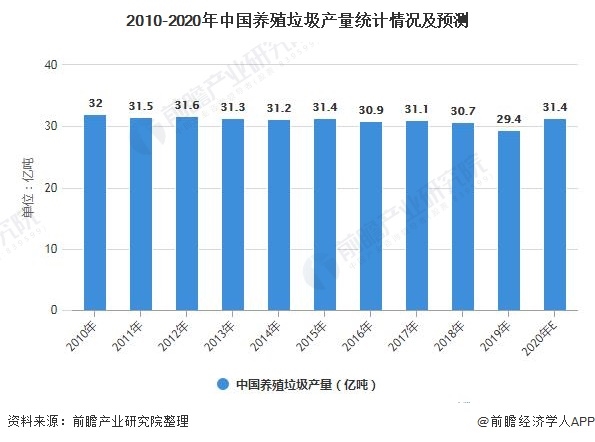 快速發(fā)展的畜牧業(yè),在保證了不斷增長(zhǎng)的畜產(chǎn)品需求的同時(shí),也產(chǎn)生了大量的養(yǎng)殖廢棄物。不同禽畜產(chǎn)生的糞便量不同,前瞻根據(jù)禽畜養(yǎng)殖規(guī)模,結(jié)合禽畜飼養(yǎng)周期以及飼養(yǎng)量對(duì)全國(guó)養(yǎng)殖垃圾產(chǎn)量進(jìn)行估計(jì),2020年全國(guó)養(yǎng)殖垃圾產(chǎn)量約為31.4億噸,給環(huán)境治理帶來(lái)了巨大的壓力。