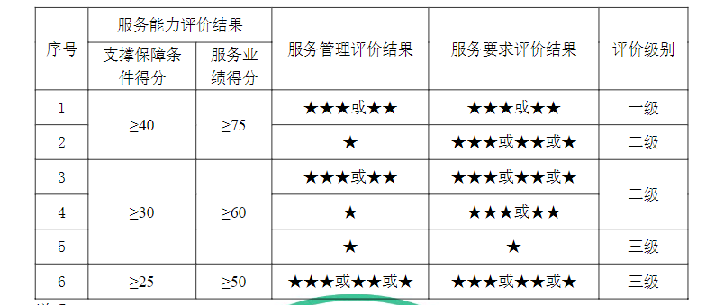 說明:1.支撐保障條件得分≥40,且服務業(yè)績得分≥75,只要服務管理評價結(jié)果或服務要求評價結(jié)果被評為★,則評價級別為二級。2.支撐保障條件得分≥30,且服務業(yè)績得分≥60,只要服務管理評價結(jié)果和服務要求評價結(jié)果同時被評為★,則評價級別為三級。