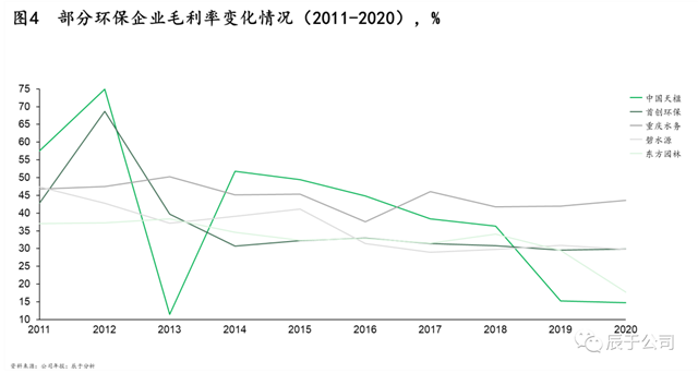 因此,地方政府一方面想辦法壓低項目盈利水平降低投入,一方面尋求其他“合法”融資渠道解困。近年來大型生態(tài)環(huán)保企業(yè)的盈利水平逐步下降印證了項目盈利降低的趨勢(見圖),盈利就幾個點,融資成本極低的大型國企、央企在競爭中處于優(yōu)勢,幾個點的融資成本決定了項目的成與否;尋找融資渠道下,地方生態(tài)環(huán)保集團(tuán)應(yīng)運(yùn)而生,對跨市統(tǒng)籌、投資公益性回報比較差的項目等,將起到積極的作用。