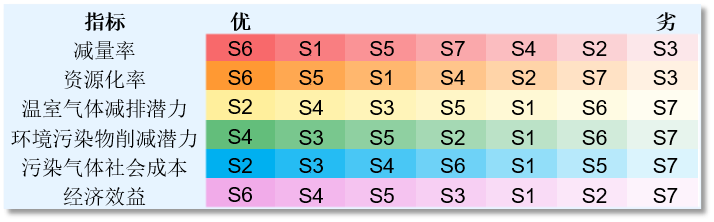 資源化率為資源化產(chǎn)品的產(chǎn)出量。S6處理技術(shù)資源利用率高、有機肥產(chǎn)品市場大而且具有最高的盈利能力。S4的資源產(chǎn)品主要是有機酸性土壤改良劑和有機肥料,具有很好的土壤改良和施肥效果。