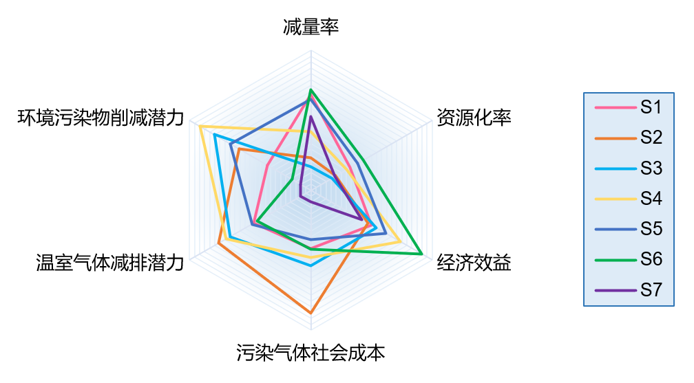 通過綜合考慮多項指標(biāo),可以得到各項技術(shù)的指標(biāo)表現(xiàn)雷達(dá)圖,同時也可以看出各指標(biāo)下不同處理技術(shù)的表現(xiàn)排名。