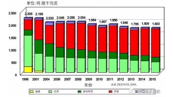 圖2顯示了德國在1998-2015年期間污水廠污泥的處置發(fā)展情況。