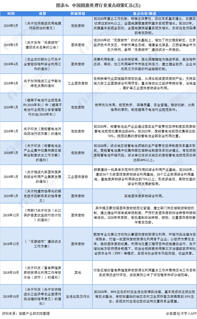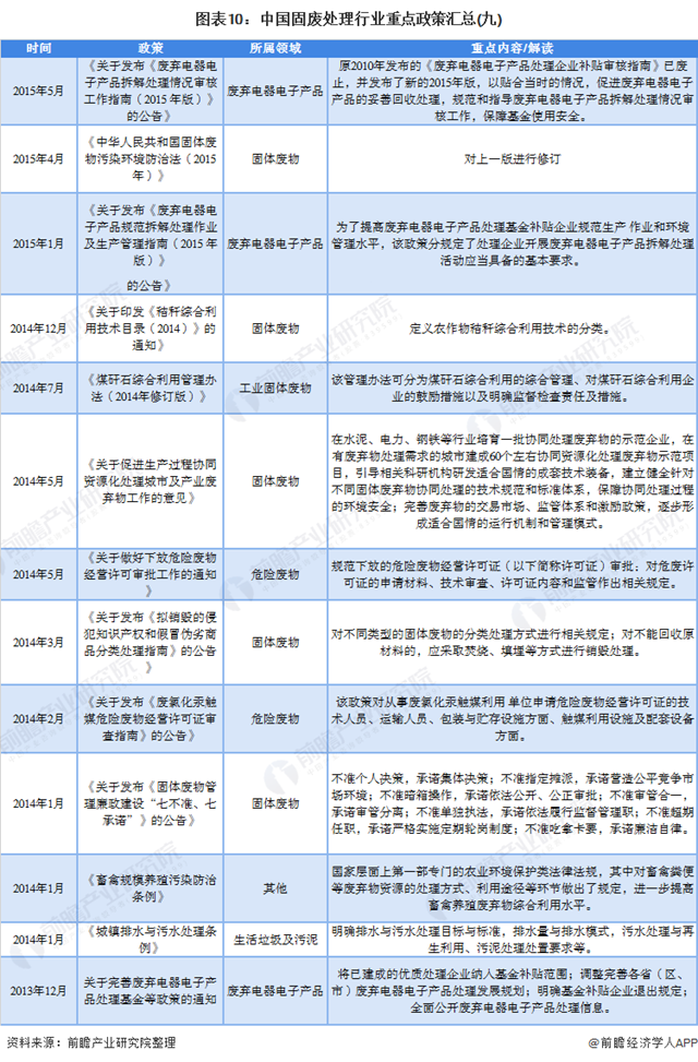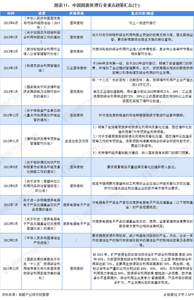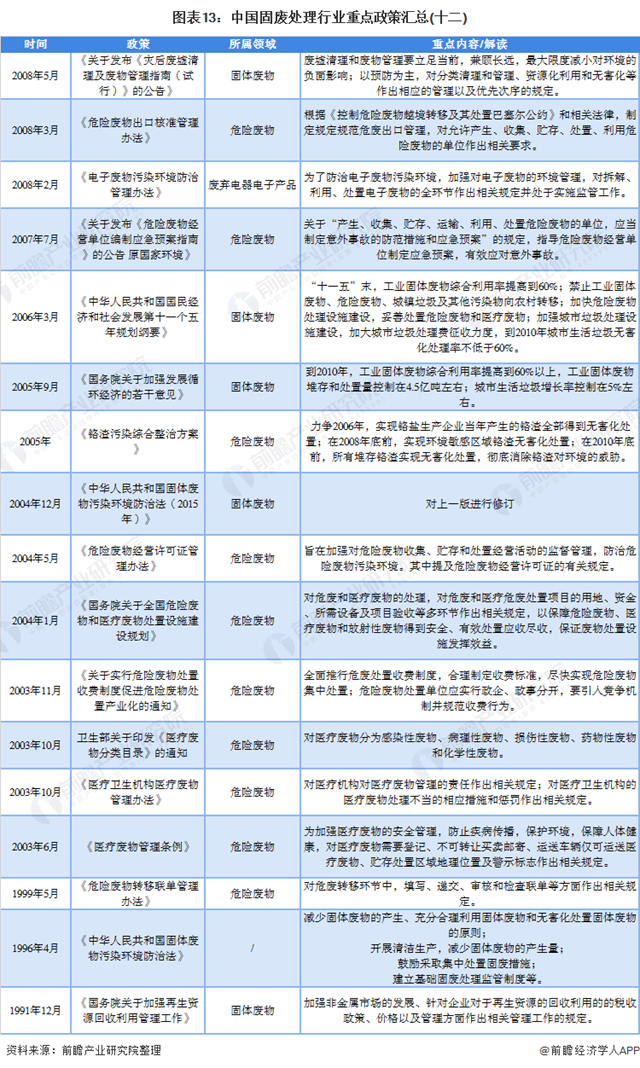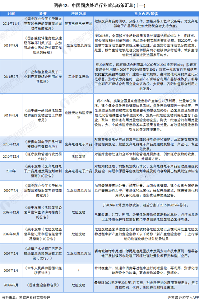 我國固廢行業(yè)相關(guān)的重點政策針對方面主要可分為綜合固體廢物、危險廢物、工業(yè)固體廢物、廢棄電器電子產(chǎn)品、生活垃圾及污泥及其他,在該基礎(chǔ)上,針對不同方面出臺了數(shù)量相當(dāng)?shù)恼咭砸?guī)定和支持固廢處理及其相關(guān)產(chǎn)業(yè)(例如,垃圾焚燒發(fā)電等)的產(chǎn)業(yè)化發(fā)展。