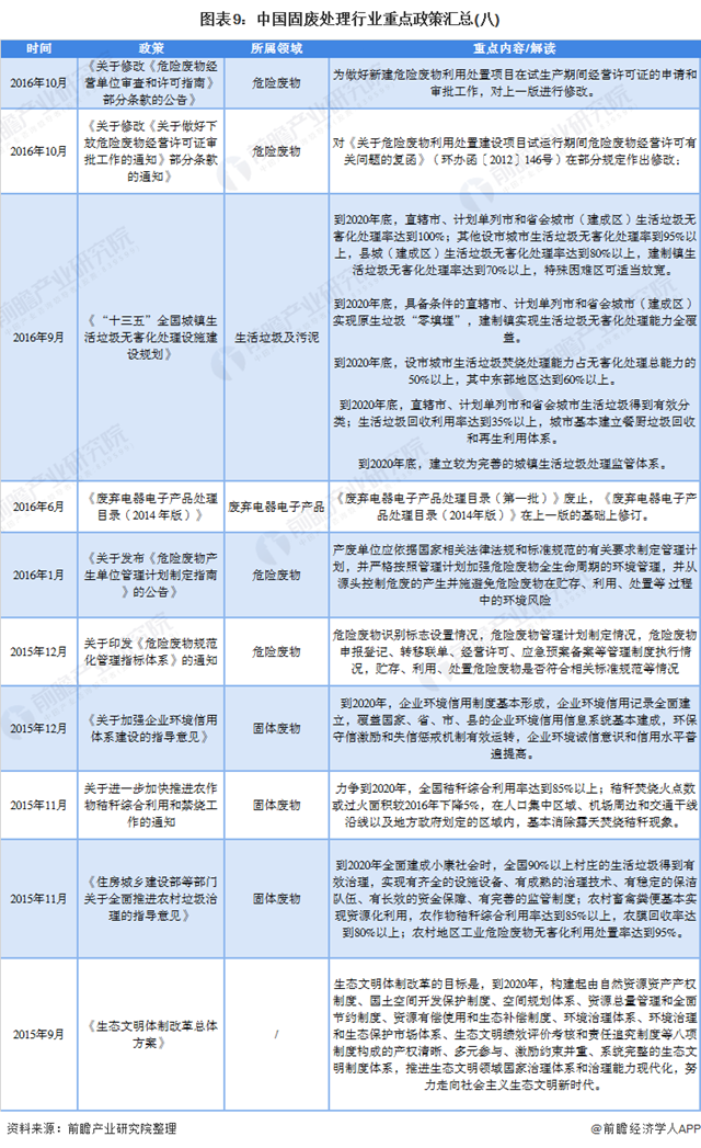 從“八五”規(guī)劃開始,我國就在國家層面戰(zhàn)略中不斷對固廢處理的概念和規(guī)劃進(jìn)行優(yōu)化。從“八五”的普遍固體廢物綜合利用的概念,到“九五”出現(xiàn)生活垃圾無害化處理, “十五”的危險廢物集中處理,“十一五”的醫(yī)療廢物、廢棄電子產(chǎn)品和秸稈、農(nóng)膜、禽畜糞便等其他固體廢物,“十三五”的餐廚垃圾和建筑垃圾等一系列新的固廢概念的出現(xiàn)和分類標(biāo)準(zhǔn)的變更,給我國的固廢處理行業(yè)帶來了新的機(jī)遇與更高要求的政策標(biāo)準(zhǔn)。