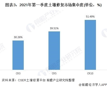 目前,中國(guó)土壤修復(fù)行業(yè)的市場(chǎng)集中度較低,競(jìng)爭(zhēng)較為激烈。CSER土壤修復(fù)平臺(tái)數(shù)據(jù)顯示,2021年第一季度土壤修復(fù)項(xiàng)目中標(biāo)金額前3的中標(biāo)金額份額合計(jì)30.26%,排名前5的份額合計(jì)為39.51%,排名前5的份額合計(jì)為51.49%,市場(chǎng)集中度較高。