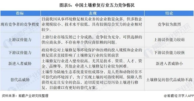 從五力競(jìng)爭(zhēng)模型角度分析中國(guó)土壤修復(fù)行業(yè)競(jìng)爭(zhēng)情況如下: