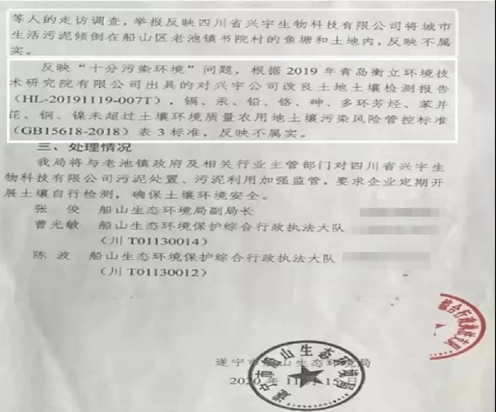 遂寧為什么會(huì)出現(xiàn)如此嚴(yán)重的污泥非法填埋問(wèn)題?與監(jiān)管失職有關(guān)。據(jù)了解,對(duì)于新景源環(huán)保的污泥非法處置問(wèn)題,周邊群眾反映非常強(qiáng)烈。2015年以來(lái),該問(wèn)題先后被群眾投訴過(guò)14次。但是,當(dāng)?shù)叵嚓P(guān)職能部門(mén)嚴(yán)重失職失責(zé),既不認(rèn)真調(diào)查處理群眾投訴問(wèn)題,也不按規(guī)定查處新景源環(huán)保的違法行為,導(dǎo)致企業(yè)有恃無(wú)恐,問(wèn)題愈演愈烈。不光是群眾投訴沒(méi)人理,就連相關(guān)政府部門(mén)的投訴也起不到作用。2019年7月,船山區(qū)老池鎮(zhèn)政府曾經(jīng)分別致函船山區(qū)住建、生態(tài)環(huán)境等部門(mén),請(qǐng)求調(diào)查處理該企業(yè)違法問(wèn)題,但相關(guān)部門(mén)不聞不問(wèn),放任問(wèn)題長(zhǎng)期存在。特別是2020年11月,四川省省級(jí)生態(tài)環(huán)保督察進(jìn)駐遂寧市期間,群眾再次投訴該公司非法傾倒填埋污泥問(wèn)題,但是船山區(qū)卻回復(fù)謊稱群眾反映問(wèn)題不屬實(shí)。遂寧市也未經(jīng)認(rèn)真核實(shí)就原樣轉(zhuǎn)報(bào)調(diào)查結(jié)論,導(dǎo)致問(wèn)題依然未能得到及時(shí)解決。船山區(qū)向省級(jí)督察組回復(fù)謊稱群眾反映問(wèn)題不屬實(shí)▼