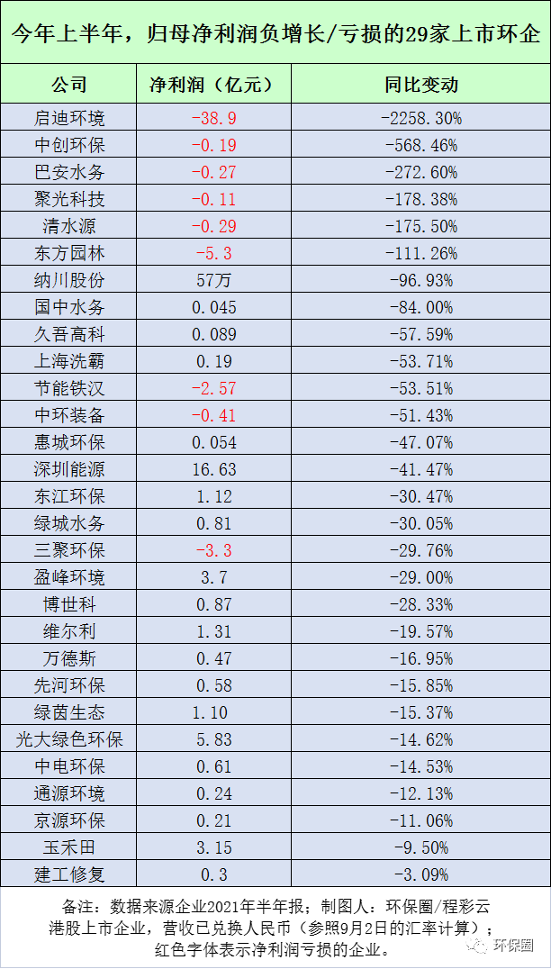 也就是說,今年上半年,111家上市環(huán)企中,無論是營業(yè)收入,還是歸母凈利潤方面,大家都表現(xiàn)得不錯,一掃2020年的悲觀情緒,70%以上的環(huán)保企業(yè)都向股東和市場交付了一張靚麗的答卷,實(shí)現(xiàn)了“后疫情時(shí)代”的強(qiáng)勢反彈。具體到個(gè)股,絕大多數(shù)企業(yè)也都在今年上半年開了個(gè)好頭,經(jīng)營業(yè)績打了個(gè)漂亮“翻身仗”。有的一改往日業(yè)績頹勢,歸母凈利潤實(shí)現(xiàn)百分之幾千增長,如雪浪環(huán)境,城發(fā)環(huán)境、雪迪龍;也有的逐步擺脫虧損帽子,歸母凈利潤實(shí)現(xiàn)百分之幾百的大增,如中金環(huán)境、嶺南股份、蒙草生態(tài)、津膜科技、菲達(dá)環(huán)保等;還有的細(xì)分領(lǐng)域龍頭,如上文提到格林美、碧水源、清新環(huán)境,也從去年疫情和產(chǎn)業(yè)寒冬的陣痛中慢慢地企穩(wěn)、好轉(zhuǎn),重現(xiàn)往日輝煌。歷經(jīng)了金融領(lǐng)域去杠桿、PPP政策強(qiáng)監(jiān)管、新冠肺炎疫情沖擊以及民企易主“混改潮”后,這些上市環(huán)企雖然有過迷茫,有過失敗,有過反思,但最終還是重拾信心,不屈不撓,終于迎來了業(yè)績復(fù)蘇。不過,今年上半年,在業(yè)績普遍好轉(zhuǎn)的背景下,依然還是有個(gè)別環(huán)保企業(yè)“不爭氣”,表現(xiàn)差強(qiáng)人意,比如啟迪環(huán)境、巴安水務(wù)、節(jié)能國禎、聚光科技、中環(huán)裝備等10家企業(yè)(如圖三所示),營收和凈利潤雙雙下滑,甚至有的企業(yè)較上年同期,虧損幅度擴(kuò)大化,前景堪憂。圖三:今年上半年,營收和凈利潤“雙降”的10家上市環(huán)企▼