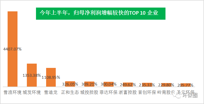 營收變動幅度方面,數(shù)據(jù)同樣喜人。111家上市環(huán)企,除了那些穩(wěn)步連續(xù)增長“卓越者”,每年總有一些讓人意想不到的“黑馬”企業(yè)率先突圍出來,少則百分之幾百增長,多則百分之上千增長,成為上半年?duì)I收增速最快的10家先鋒企業(yè)。在半年度營收增速TOP10中,既有坐落于上海的房產(chǎn)/水務(wù)/固廢“三劍齊發(fā)”的城投控股以及旗下的上海環(huán)境,也有因納入電價(jià)補(bǔ)貼、部分焚燒項(xiàng)目轉(zhuǎn)運(yùn)營推動業(yè)績大增的城發(fā)環(huán)境和圣元環(huán)保,亦有去年業(yè)績還萎靡不振的萬邦達(dá)和東方園林(如圖六所示)。圖六:半年度營收增速較快的TOP10榜單▼