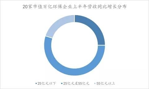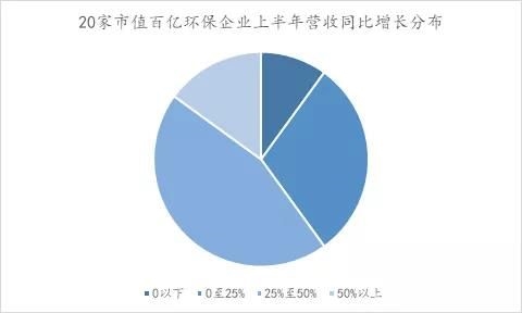就20家市值百億環(huán)保企業(yè)上半年?duì)I收同比增長(zhǎng)分布情況來(lái)看,增長(zhǎng)維持在25%至50%以?xún)?nèi)企業(yè)共9家,占比45%;增長(zhǎng)為25%以下企業(yè)共6家,占比30%。