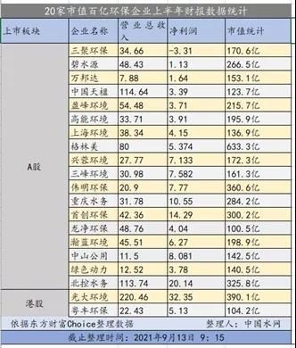 2021年上半年各項(xiàng)利好環(huán)保政策相繼出臺(tái),各地釋放千億級(jí)環(huán)保市場(chǎng),一并推動(dòng)環(huán)保企業(yè)競(jìng)爭(zhēng)走向白熱化。上半年環(huán)保賽道企業(yè)業(yè)績(jī)先后發(fā)布,百億級(jí)企業(yè)爭(zhēng)先交出亮眼成績(jī)。據(jù)中國(guó)水網(wǎng)不完全統(tǒng)計(jì),2021年上半年約有20家市值百億級(jí)的環(huán)保企業(yè),現(xiàn)對(duì)其凈利潤(rùn)、營(yíng)收等關(guān)鍵財(cái)務(wù)指標(biāo)進(jìn)行一一盤(pán)點(diǎn)……,一起來(lái)了解一下吧!