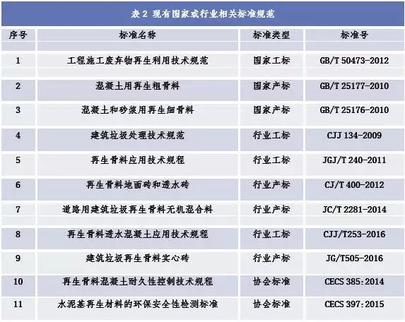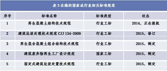 目前,建筑垃圾管理與資源化標(biāo)準(zhǔn)體系正在建設(shè)中,現(xiàn)有的建筑垃圾資源化利用及再生產(chǎn)品生產(chǎn)與應(yīng)用相關(guān)國家及行業(yè)標(biāo)準(zhǔn)規(guī)范有11項(xiàng),在編的相關(guān)標(biāo)準(zhǔn)規(guī)范有5項(xiàng)(詳見表2、表3),其中強(qiáng)制性標(biāo)準(zhǔn)條文不多,在某種程度上制約了再生產(chǎn)品的生產(chǎn)、使用和推廣。