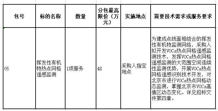 北京市揮發(fā)性有機物解析能力建設一期(中央資金)-揮發(fā)性有機物熱點網(wǎng)格遙感監(jiān)測公開招標公告