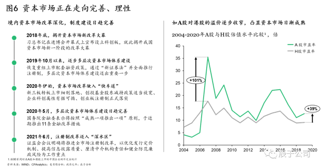 政策推動(dòng)下,國內(nèi)資本市場改革逐步深化,制度建設(shè)日趨完善,生態(tài)環(huán)保企業(yè)面臨的資本市場大環(huán)境正走向理性。A股對H股的溢價(jià)逐步收窄便是其中一佐證:基于對95家同時(shí)在A股和港股上市的企業(yè)的分析,可以看到相比于2006年最高峰時(shí)A股對H股超過100%的溢價(jià),當(dāng)前30%-40%的溢價(jià)已有明顯收窄(見圖6)。
