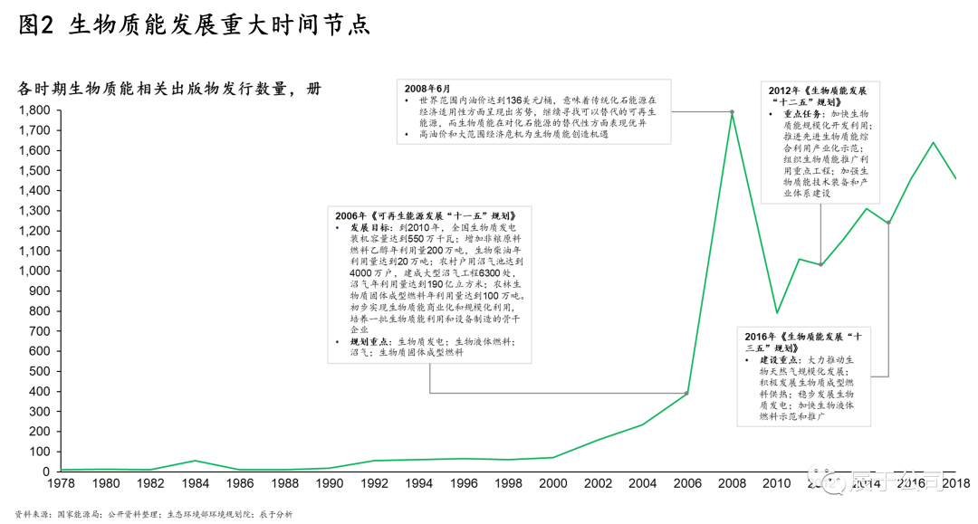 然而總的來(lái)說(shuō),生物質(zhì)能發(fā)展的時(shí)間并不長(zhǎng),21世紀(jì)以前這個(gè)領(lǐng)域的相關(guān)研究極少,我國(guó)也直到“十一五”才首次將其納入規(guī)劃范圍。2008年石油危機(jī)促使人類(lèi)開(kāi)始尋找替代能源,生物質(zhì)能也逐漸成為一個(gè)重要的選項(xiàng)(見(jiàn)圖2)。