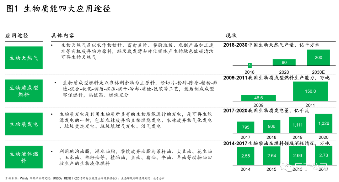 生物質(zhì)能是指太陽(yáng)能以化學(xué)能形式儲(chǔ)存在生物質(zhì)中的能量形式,燒柴火便是對(duì)生物質(zhì)能的利用,自從人類(lèi)學(xué)會(huì)了使用火,生物質(zhì)能就成為重要的能源來(lái)源之一。現(xiàn)代生物質(zhì)能行業(yè)進(jìn)一步對(duì)各種有機(jī)質(zhì)中的能源進(jìn)行加工和轉(zhuǎn)換,變成各類(lèi)更易儲(chǔ)存、運(yùn)輸和使用的能源類(lèi)型,具體可分為四大類(lèi)別:生物天然氣,生物質(zhì)發(fā)電,生物質(zhì)成型燃料,生物液體燃料。這四類(lèi)均已有一定的發(fā)展基礎(chǔ)(見(jiàn)圖1)。