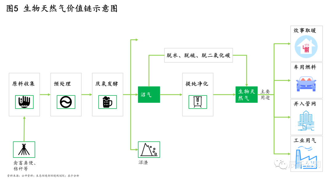 生物天然氣是指通過(guò)對(duì)秸稈、人畜糞便等生物質(zhì)經(jīng)過(guò)發(fā)酵形成沼氣后,進(jìn)一步提純獲得的天然氣,作為天然氣的替代品用于家庭炊事取暖、車(chē)用燃料、工業(yè)用氣等領(lǐng)域,它的價(jià)值鏈較長(zhǎng)(見(jiàn)圖5)。