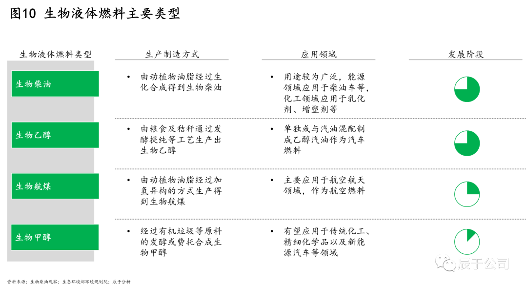 生物液體燃料是指把生物質(zhì)經(jīng)過(guò)發(fā)酵提純或者生化合成的方式制造成乙醇或油類(lèi)等液體燃料,目前主要包括生物柴油、生物乙醇、生物航煤、生物甲醇等類(lèi)型,生產(chǎn)制造方式各異,其中生物柴油、生物乙醇發(fā)展較為成熟(圖10)。