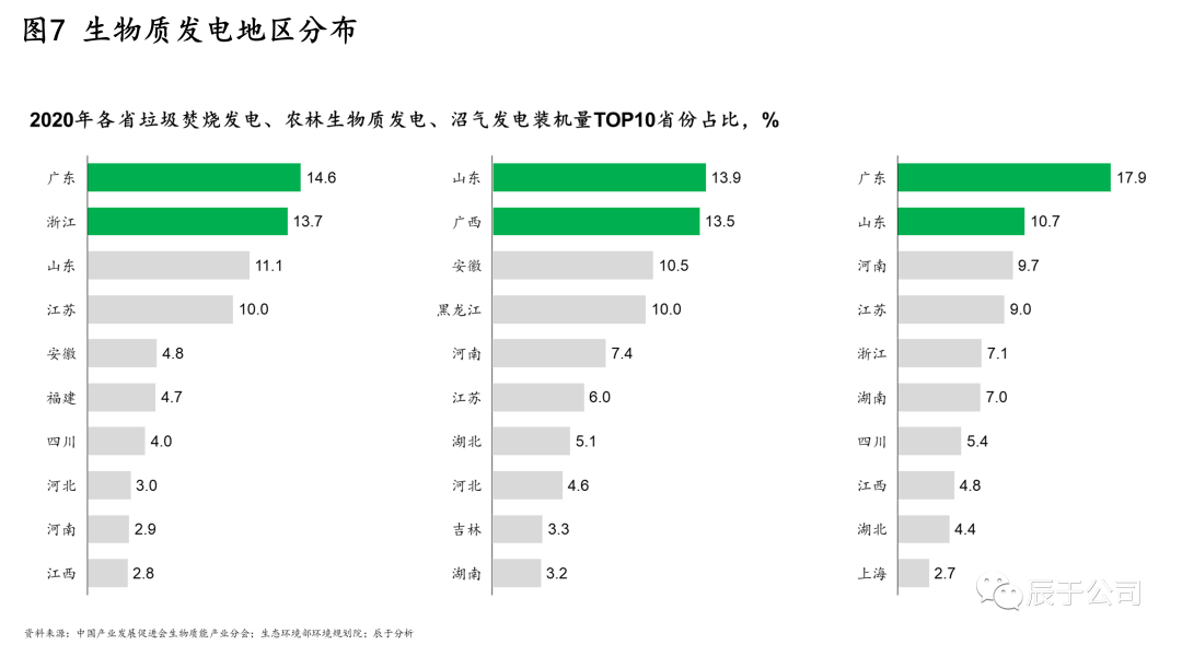 在地區(qū)分布上,各類(lèi)型的生物質(zhì)發(fā)電集中于華東華南地區(qū),但各地區(qū)側(cè)重點(diǎn)有所不同。截至2020年底,垃圾焚燒發(fā)電集中在廣東省、浙江省、山東省、江蘇省、安徽省等地區(qū),合計(jì)占全國(guó)累計(jì)裝機(jī)容量的54%;農(nóng)林生物質(zhì)發(fā)電主要集中于山東省、湖北省、安徽省、黑龍江省、河南省,合計(jì)占比達(dá)到55.3%;沼氣發(fā)電主要集中于廣東省、山東省、河南省、江蘇省、浙江省,合計(jì)占比達(dá)到54.3%(見(jiàn)圖7)。