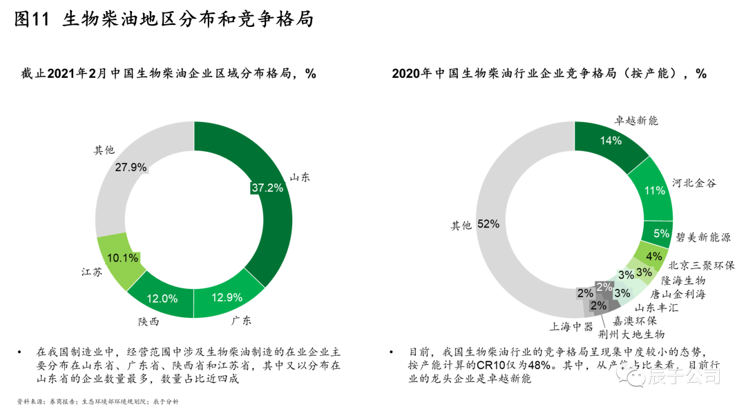 在銷(xiāo)售應(yīng)用上,國(guó)內(nèi)的主要渠道是出口、交通燃料、化工等,出口是拉動(dòng)行業(yè)發(fā)展的主要渠道,2019年出口占產(chǎn)量的比例達(dá)到80%。國(guó)內(nèi)需求的打開(kāi)是行業(yè)發(fā)展的最大希冀,其中最有望打開(kāi)的市場(chǎng)是交通燃料領(lǐng)域——生物柴油強(qiáng)制添加政策。部分城市已經(jīng)開(kāi)始在試點(diǎn),上海市2013年開(kāi)始在公交車(chē)上實(shí)行B5標(biāo)準(zhǔn)(添加比例5%)?,F(xiàn)在國(guó)家已開(kāi)始全國(guó)范圍進(jìn)行B5 強(qiáng)制添加標(biāo)準(zhǔn)的意見(jiàn)征求,并有望隨著雙碳目標(biāo)深入推進(jìn)提升到B10。若政策落地實(shí)施,將產(chǎn)生450萬(wàn)噸~1000萬(wàn)噸的產(chǎn)能缺口。