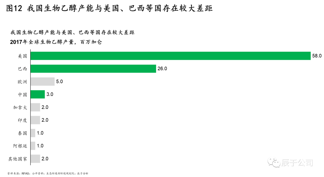 我國(guó)發(fā)展生物乙醇的總思路是“核準(zhǔn)生產(chǎn)、定向流通、封閉運(yùn)行、有序發(fā)展”,生物乙醇的生產(chǎn)、流通、銷(xiāo)售等都在嚴(yán)格限制范圍內(nèi)進(jìn)行,目標(biāo)到2025年達(dá)到688萬(wàn)噸產(chǎn)量(2020年400萬(wàn)噸)。但這一數(shù)字與美國(guó)、巴西等國(guó)家相比差距較遠(yuǎn),2017年全球生物乙醇產(chǎn)量中,中國(guó)的產(chǎn)量只有美國(guó)的二十分之一(見(jiàn)圖12)。