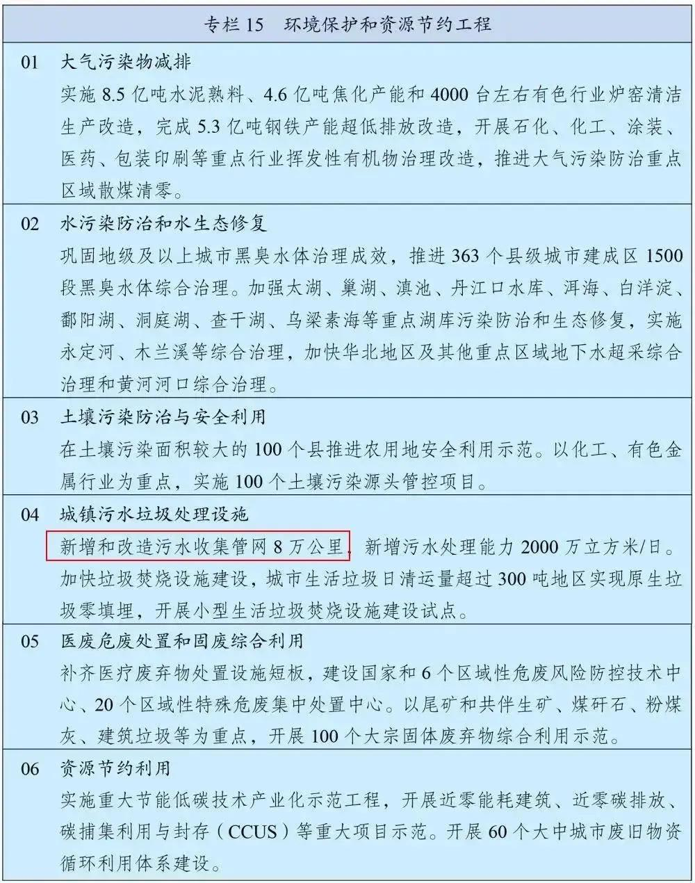 例如,在“十四五”規(guī)劃第三十八章第二節(jié)中,“推進城鎮(zhèn)污水管網全覆蓋”就排在精準提標、污泥無害化、污水資源化等之前,在水污染治理中位列第一。