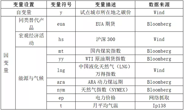 回顧上述文獻可以發(fā)現(xiàn),多數(shù)國內(nèi)外學(xué)者的研究證實了同類替代品、宏觀經(jīng)濟活動、能源與氣候變化會對碳價有較為顯著的影響。為了進一步探究這一系列影響因素對碳價的共同影響,并比較其相關(guān)性,本文將在這三個層面選取部分代表性指標,并將其聯(lián)立以分析影響結(jié)果。
