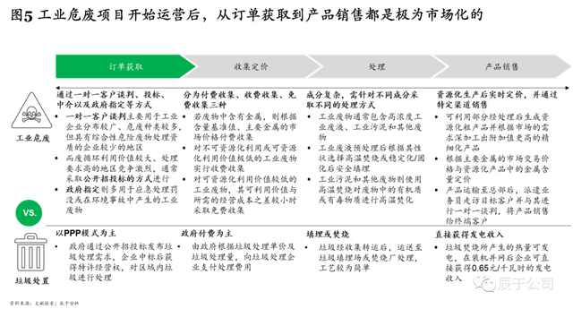 值得注意的是,工業(yè)危廢運(yùn)營階段的競(jìng)爭(zhēng)同樣十分激烈,從來料獲取到產(chǎn)品銷售都極為市場(chǎng)化(見圖5)。以訂單獲取為例,工業(yè)危廢往往需要通過一對(duì)一客戶談判、投標(biāo)、中介以及政府指定等方式來展開,這與傳統(tǒng)的垃圾處置行業(yè)以PPP模式為主是截然不同的。
