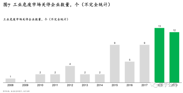 一是與市場(chǎng)需求種類不匹配,根據(jù)2019年最新修訂發(fā)布的《國家危險(xiǎn)廢物名錄》,我國危險(xiǎn)廢物分類共有46大類,471種,而我國90%以上危廢處置企業(yè)僅能處置5種或以下的危廢種類,供需種類錯(cuò)配的現(xiàn)象較嚴(yán)重;二是產(chǎn)能落后,處置規(guī)模小,技術(shù)和使用設(shè)備落后,無法滿足污染防治的要求;三是安全隱患突出,環(huán)境管理水平低下以及相關(guān)危險(xiǎn)廢物經(jīng)營安全的規(guī)章制度不完善,導(dǎo)致環(huán)境安全隱患問題突出??梢灶A(yù)見的是,隨著市場(chǎng)競(jìng)爭(zhēng)日益激烈,“小而弱”的工業(yè)危廢企業(yè)將越來越難以適應(yīng)市場(chǎng)新要求,頻頻被“出清”。據(jù)不完全統(tǒng)計(jì),2010-2014年,每年關(guān)停的工業(yè)危廢服務(wù)企業(yè)僅為2——4家,2018和2019年則分別達(dá)到了13和12家(見圖7)。