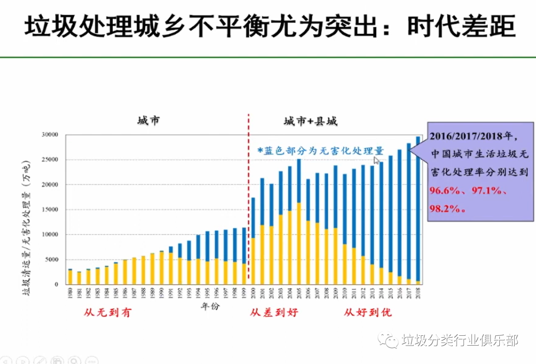 當(dāng)前城市的垃圾處理基本問題已解決,現(xiàn)在要在分類的新的理念引領(lǐng)下,我們向著可以構(gòu)建新型模式,但是我們大的無害化處理這些問題已基本得到解決。2018年垃圾的垃圾無害化處理已經(jīng)達(dá)到了98.2%,而農(nóng)村連基本數(shù)據(jù)都沒有,農(nóng)村的數(shù)據(jù)很多都是估計的?,F(xiàn)代化的管理是數(shù)字化的管理、信息化的管理,沒有數(shù)字就表明對它是沒有管理。底數(shù)不清,說明對它的管理薄弱。