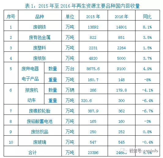 1、回收量。在宏觀經(jīng)濟(jì)形勢(shì)總體下行的背景下,再生資源回收行業(yè)總體規(guī)模不但沒(méi)有出現(xiàn)大幅下滑,而且有了一定幅度的增長(zhǎng)。據(jù)中再生協(xié)會(huì)統(tǒng)計(jì)顯示,2016年,廢鋼、廢有色金屬、廢塑料、廢紙、廢棄電器電子產(chǎn)品、報(bào)廢汽車(chē)、廢橡膠輪胎、廢鉛酸蓄電池、廢紡織品、廢玻璃等10個(gè)主要品種國(guó)內(nèi)回收量2.47億噸(見(jiàn)表1),比2015年同比增長(zhǎng)5.5%。