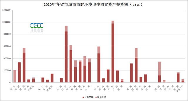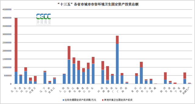 從區(qū)域來看,2020年,廣東(97.3億元)、江蘇(84.6億元)、浙江(53.7億元)以及河北(49.7億元)、河南(48.3億元)等地環(huán)境市容衛(wèi)生設施建設投入較大,其中大部分資金用于垃圾處理設施建設。整個“十三五”時期,北京、廣東、江蘇等地城市環(huán)境衛(wèi)生固定資產投資較大,其中北京五年的投資額接近400億,特別是2016年、2017年兩年,投資額均在百億以上。