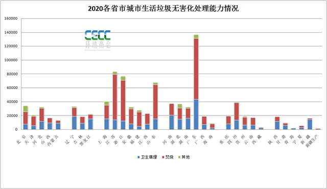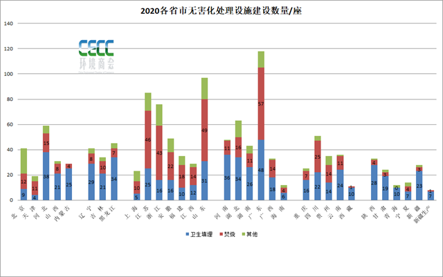 截至2020年,廣東、山東、江蘇、浙江四個省無害處理設施建設數量領跑,分別為118座、97座、85座和76座,它們建設的垃圾焚燒處理設施也最多,分別擁有57座、49座、46座、43座。而衛(wèi)生填埋場相對較多的省市則是廣東省(48座)、河北省(38座),河南省(36座),湖北省(34座)。按區(qū)域來看,華北地區(qū)、華中地區(qū)以及西南地區(qū)、東北地區(qū)建設垃圾填埋場數量明顯多于華東、華南地區(qū)。