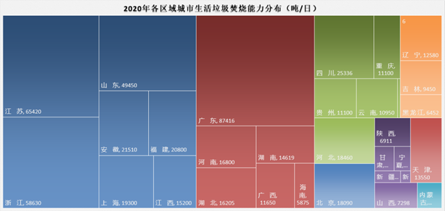 如果從無害化處理能力來看,又是另一番景象。廣東、山東、江蘇、浙江四省無害化處理能力仍然領跑,其中垃圾焚燒處理能力分別達到87416噸/日、49450噸/日、65420噸/日、58630噸/日。可以看到排序略有變化,江蘇、浙江的垃圾焚燒處理能力高于山東省,推算如果論平均單體垃圾焚燒項目規(guī)模,江蘇和浙江省高于山東省。數據中還可以看到,這幾個省份是大力發(fā)展生活垃圾焚燒的省份,不僅焚燒廠建得多,而且垃圾焚燒日處理能力和處理量也處在突出高位。