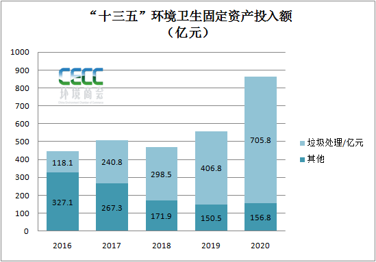 “十三五”時期,城市市容環(huán)境衛(wèi)生累計固定資產投資總額2844億元,其中垃圾處理累計投資1770億元,較“十二五”整體增長145%。2020年,市容環(huán)境衛(wèi)生方面的固定資產投資額為862.648億元,占全年固定資產總投資的3.9%,其中垃圾處理設施建設投入資金逐年提升,從2016年118億左右增至2020年705.8億元,投資額占環(huán)境衛(wèi)生固定資產投資總額的比例較“十二五”提升42.2%。